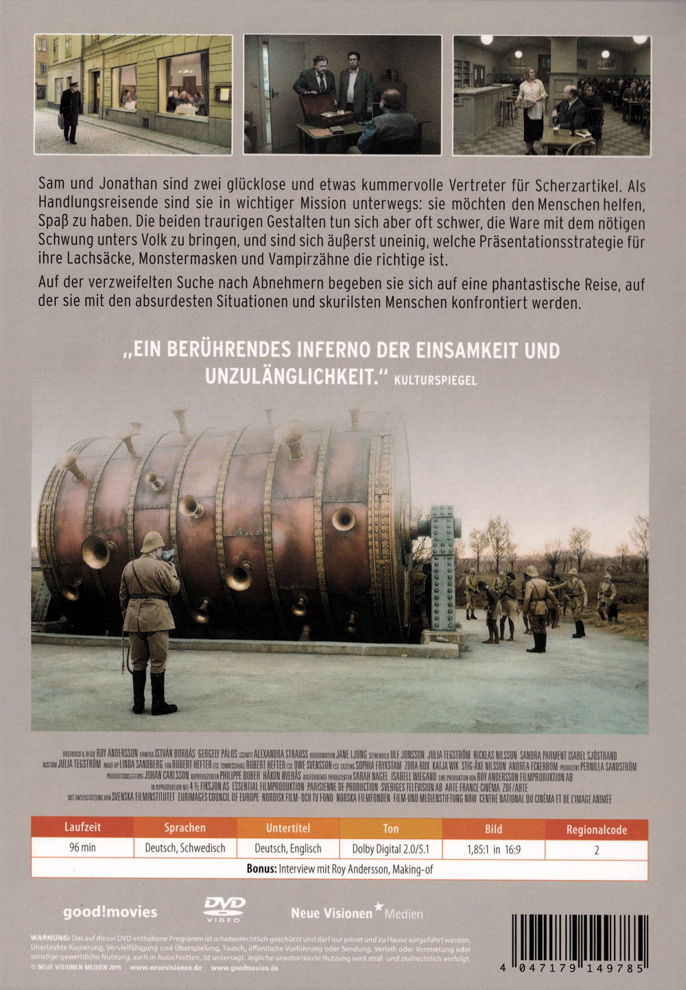 Sam und Jonathan sind zwei glücklose und etwas kummervolle Vertreter für Scherzartikel. Als Handlungsreisende sind sie in wichtiger Mission unterwegs: sie möchten den Menschen helfen, Spass zu haben. Da die Welt voller Enttäuschungen und eine seltsam einsame Angelegenheit ist, haben sie sich auf die Klassiker unter den Kuriositäten spezialisiert: Vampirzähne, Lachsack und eine groteske Monstermaske. Sam und Jonathan tun sich oft schwer, die Ware mit dem nötigen Schwung unters Volk zu bringen, doch Verkaufen müssen sie den Spass, denn das kabbelnde Verkäuferduo ist furchtbar pleite. So gehen sie auf eine phantastische Reise durch Räume der Geschichte und finden sich in traumverlorenen Erinnerungen wieder – an verliebte Könige, getauschte Küsse und fröhlich gurrende Tauben. Der Gewinner des Goldenen Löwen von Venedig schickt uns auf eine märchenhafte Irrfahrt durch Menschliches und Allzumenschliches. Es ist eine Reise in grandiosen Sketchen, die die Schönheit eines einzelnen Moments offenbaren, aber auch die Verlorenheit anderer, den Humor und die Tragik, die in uns wohnen, die ganze Pracht des Lebens und die unvermeidliche Schwäche der Menschen.