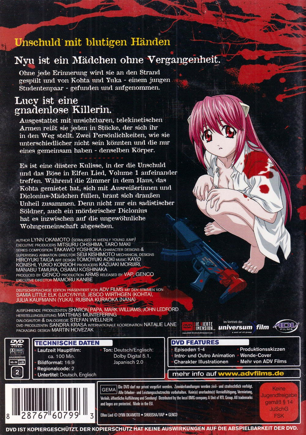 Vektor 1: Unschuld mit blutigen Händen. Nyu ist ein Mädchen ohne Vergangenheit. Ohne jede Erinnerung wird sie an den Strand gespült und von Kohta und Yuka - einem jungen Studentenpaar - gefunden und aufgenommen. Lucy ist eine gnadenlose Killerin. Ausgestattet mit unsichtbaren telekinetischen Armen reisst sie jeden in Stücke, der sich ihr in den Weg stellt. Zwei Persönlichkeiten, wie sie unterschiedlicher nicht sein könnten und die nur eines gemeinsam haben - denselben Körper. Es ist eine düstere Kulisse, in der die Unschuld und das Böse in Elfen Lied, Volume 1 aufeinander treffen. Während die Zimmer in dem Haus, das Kohta gemietet hat, sich mit Ausreisserinnen und Diclonius-Mädchen füllen, braut sich draussen Unheil zusammen. Denn nicht nur ein sadistischer Söldner, auch ein mörderischer Diclonius hat es inzwischen auf die ungewöhnliche Wohngemeinschaft abgesehen.