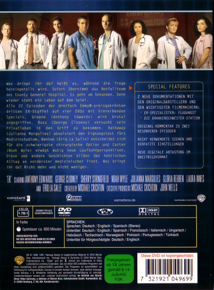 In den 22 Episoden der dritten Staffel gibt es unter anderem anstrengende Nächte für den frisch gebackenen Doktor Carter, erfährt Boulet endgültig, dass sie HIV-positiv ist, was sie ihren Kollegen verschweigt; derweil beschließt Dr. Lewis, das County General zu verlassen. Mark Greene verheimlicht ihr noch immer seine Gefühle und liegt kurz darauf selbst auf dem OP-Tisch.Erschaffen von Michael Crichton und inspiriert durch seine persönlichen Erfahrungen, die er während seines Medizinstudiums in der Notaufnahme eines Krankenhauses sammelte, entwickelte sich 'ER' zu einer der spannendsten Fernsehserien der 90er-Jahre - mit Mut zu realistischer Darstellung und ausgefallenem Humor.
