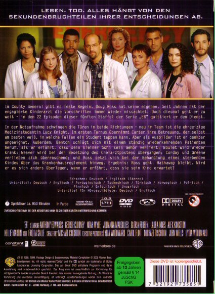 Im County General gibt es feste regeln. Doug Ross hat seine eigenen. Seit Jahren hat der engagierte Kinderarzt die Vorschriften immer wieder missachtet. Doch diesmal geht er zu weit - in den 22 Episoden dieser fünften Staffel der Serie 'ER' quittiert er den Dienst. In der Notaufnahme schwingen die Türen in beide Richtungen - neu im Team ist die ehrgeizige Medizinstudentin Lucy Knight. Im ersten Turnus übernimmt Carter ihre Betreuung, der selbst am besten weiss, in welche Fallen ein Student tappen kann. Aber als Ausbilder ist er denkbar ungeeignet. Ausserdem: Benton schlägt sich mit einem ständig wiederkehrenden Patienten herum, als er erfährt, dass sein kleiner Sohn sein Gehör verliert; Boulet wird wieder krank; Weaver wird bei der Besetzung des Chefarztpostens übergangen; Corday und Greene verlieben sich überraschend; und Ross setzt sich bei der Behandlung eines sterbenden Kindes über das Krankenhausreglement hinweg. Ergebnis: Ross geht. Hathaway bleibt. Wird er es sich anders überlegen, wenn er erfährt, dass sie sein Kind erwartet?
