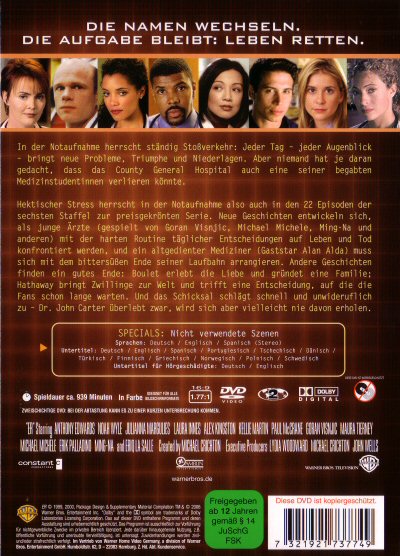 In der Notaufnahme herrscht ständig Stoßverkehr: Jeder Tag - jeder Augenblick - bringt neue Probleme, Triumphe und Niederlagen. Aber niemand hat je daran gedacht, dass das County General Hospital auch eine seiner begabten Medizinstudentinnen verlieren könnte. Hektischer Stress herrscht in der Notaufnahme also auch in den 22 Episoden der sechsten Staffel zur preisgekrönten Serie. Neue Geschichten entwickeln sich, als junge Ärzte mit der harten Routine täglicher Entscheidungen uaf Leben und Tod konfrontiert werden, un ein altgedienter Mediziner muss sich mit dem bittersüßen Ende seiner Laufbahn arrangieren. andere Geschichten finden ein gutes Ende: Boulet erlebt die Liebe und gründet eine Familie; Hathaway bringt Zwillinge zur Welt und trifft eine Entscheidung, auf die die Fans schon lange warten. Und das Schicksal schlägt schnell und unwideruflich zu - Dr. John Carter überlebt zwar, wird sich aber vielleicht nie davon erholen.