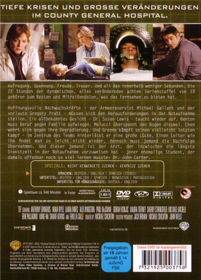 Aufregung. Spannung. Freude. Trauer. Und all das innerhalb weniger Sekunden. Die 22 Stunden der dynamischen, alles verändernden achten Serienstaffel von ER gehören zum Besten und Mitreißendsten, was das Fernsehen zu bieten hat. Hoffnungsvolle Nachwuchskräfte - der Armeereservist Michael Gallant und der vorlaute Gregory Pratt - müssen sich den Herausforderungen in der Notaufnahme stellen. Ein altbekanntes Gesicht - Dr. Susan Lewis - taucht wieder auf. Benton muss Beruf gegen Familie aufwiegen. Malucci überspannt den Bogen diesmal. Chen wehrt sich gegen ihre Degradierung. Und Greene kämpft seinen vielleicht letzten Kampf im Zentrum des Teams hinterlässt er eine grosse Lücke. Einen Leiter wie ihn findet man so leicht nicht wieder. Dennoch muss jemand die Nachfolge übernehmen. Und dieser jemand ist der Arzt, der inzwischen die längste Dienstzeit in der Notaufnahme vorzuweisen hat - jener ehemalige Student, der damals offenbar noch so viel lernen musste: Dr. John Carter.