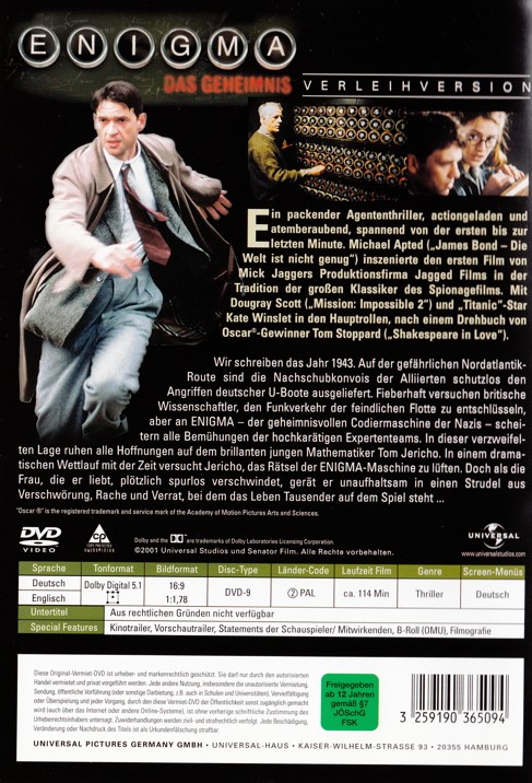 Wir schreiben das Jahr 1943. Auf der gefährlichen Nordatlantik-Route sind die Nachschubkonvois der Alliierten schutzlos den Angriffen deutscher U-Boote ausgeliefert. Fieberhaft versuchen britische Wissenschaftler, den Funkverkehr der feindlichen Flotte zu entschlüsseln, aber an Enigma - der geheimnisvollen Codiermaschine der Nazis - scheitern alle Bemühungen der hochkarätigen Expertenteams. In dieser verzweifelten Lage ruhen alle Hoffnungen auf dem brillanten jungen Mathematiker Tom Jericho. In einem dramtischen Wettlauf mit der Zeit versucht Jericho, das Rätsel der ENIGMA-Maschine zu lüften. Doch als die Frau, die er liebt, plötzlich spurlos verschwindet, gerät er unaufhaltsam in einen Strudel aus Verschwörung, Rache und Verrat, bei dem das Leben Tausender auf dem Spiel steht...