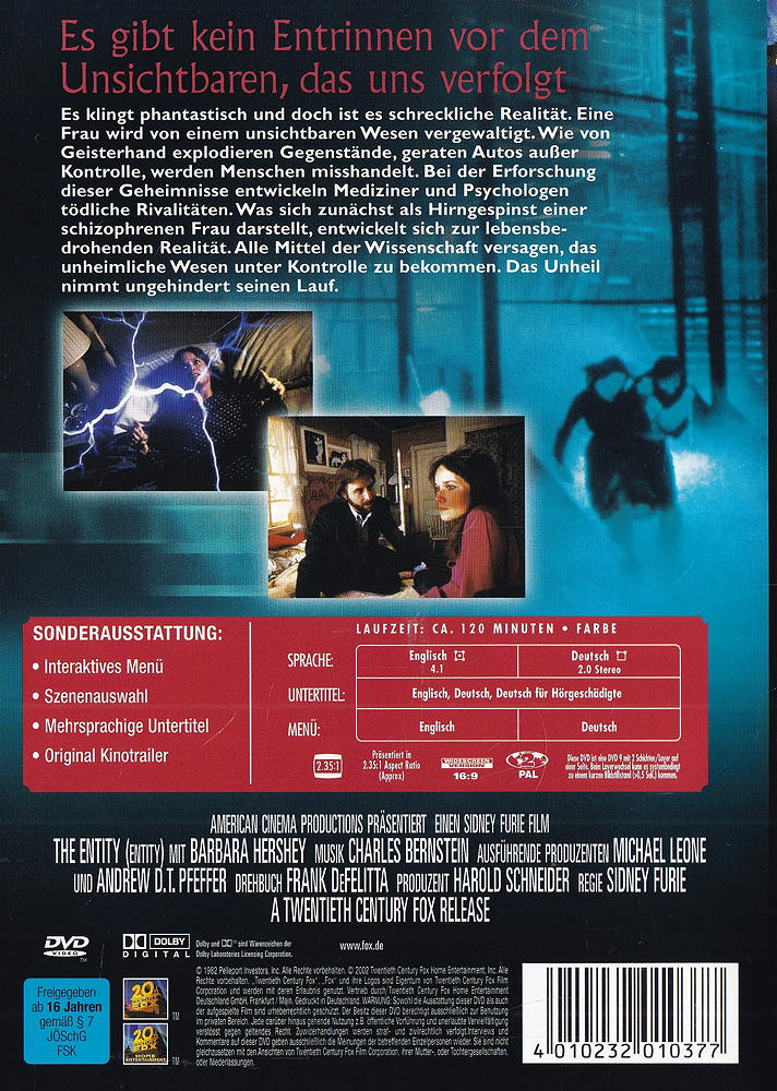 Fast zeitgleich mit Steven Spielbergs "Poltergeist" erschien mit "The Entity" Anfang der 80er eine der schockierendsten Fingerübungen in Sachen paranormale Aktivitäten. Getragen von der eindrucksvollen Performance Barbara Hersheys und unterstützt durch sehenswerte Special Effects hat Regisseur Sidney J. Fury ("Ipcress - Streng Geheim") ein Meisterwerk geschaffen, das Martin Scorsese als einen der furchterregendsten Horrorfilme aller Zeiten bezeichnet hat.