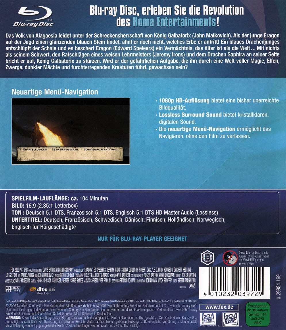 Un jeune homme, Eragon, découvre un oeuf étrange aux lueurs bleues, qui donne naissance à un Dragon femelle. Il le baptise Saphira. Le temps des Dragonniers est revenu...