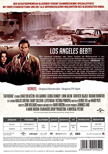 Los Angeles bebt! Das schwerste Erdbeben aller Zeiten versetzt die Millionenstadt in den Ausnahmezustand. Inmitten einstürzender Wolkenkratzer und allgegenwärtiger Panik erzählt der starbesetzte Katastrophenfilm-Klassiker ERDBEBEN von unterschiedlichsten Menschen und ihrem Kampf ums Überleben: Bauingenieur Stewart Graff (Charlton Heston) versucht mit allen Mitteln seine Frau Remy (Ava Gardner) und seinen Boss Sam Royce (Lorne Greene) in Sicherheit zu bringen. Polizist Lew Slade (George Kennedy) bemüht sich anderenorts das Chaos einzudämmen, in dem auch die junge Schauspielerin Denise (Genevieve Bujold), der Motorradfahrer Miles (Richard Roundtree) und der Supermarktbesitzer Jody (Marjoe Gortner) um ihre Existenz fürchten. Bald wird klar, dass in dieser Extremsituation nur überleben kann, wer zusammenhält.