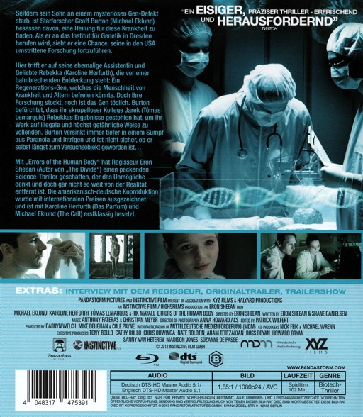 Mit ERRORS OF THE HUMAN BODY hat Regisseur Eron Sheean (Autor von "The Divide") einen packenden Science-Thriller geschaffen, der das Unmögliche denkt und doch gar nicht so weit von der Realität entfernt ist. Die amerikanisch-deutsche Koproduktion wurde mit internationalen Preisen ausgezeichnet und ist mit Karoline Herfurth ("Das Parfum") und Michael Eklund ("The Call") erstklassig besetzt.
