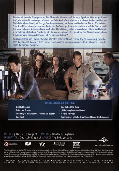 Sie überwinden die Naturgesetze. Sie führen die Wissenschaft in neue Sphären. Aber es gibt eine Kraft, die sie nicht bezwingen können: das Schicksal. EUReKA ist auch in dieser fünften und letzten Staffel die kleine Stadt mit den grossen Geheimnissen, wo Genie und Wahnsinn Tür an Tür wohnen. Zum Abschluss dieser so immens beliebten TV-Serie geht es unter anderem auf die Suche nach der verschollenen Astraeus-Crew und eine Notfallübung wird unversehens bittere Wirklichkeit. Im scheinbar idyllischen EUReKA ist nichts, wie es scheint. Und je näher das Finale kommt, desto dringlicher wird eine grosse Frage: Hat EUReKA eine Zukunft?