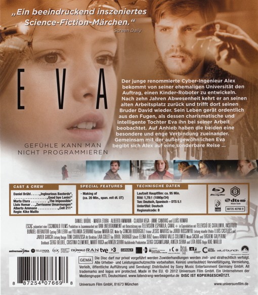 Die speziell hochbegabte kleine Eva freundet sich mit dem jungen Wissenschaftler an, der nebenan Robter baut. Zufall? Daniel Brühl ist der Held eines stilvollen und elegant angerichteten Science-Fiction-Dramas aus Spanien.