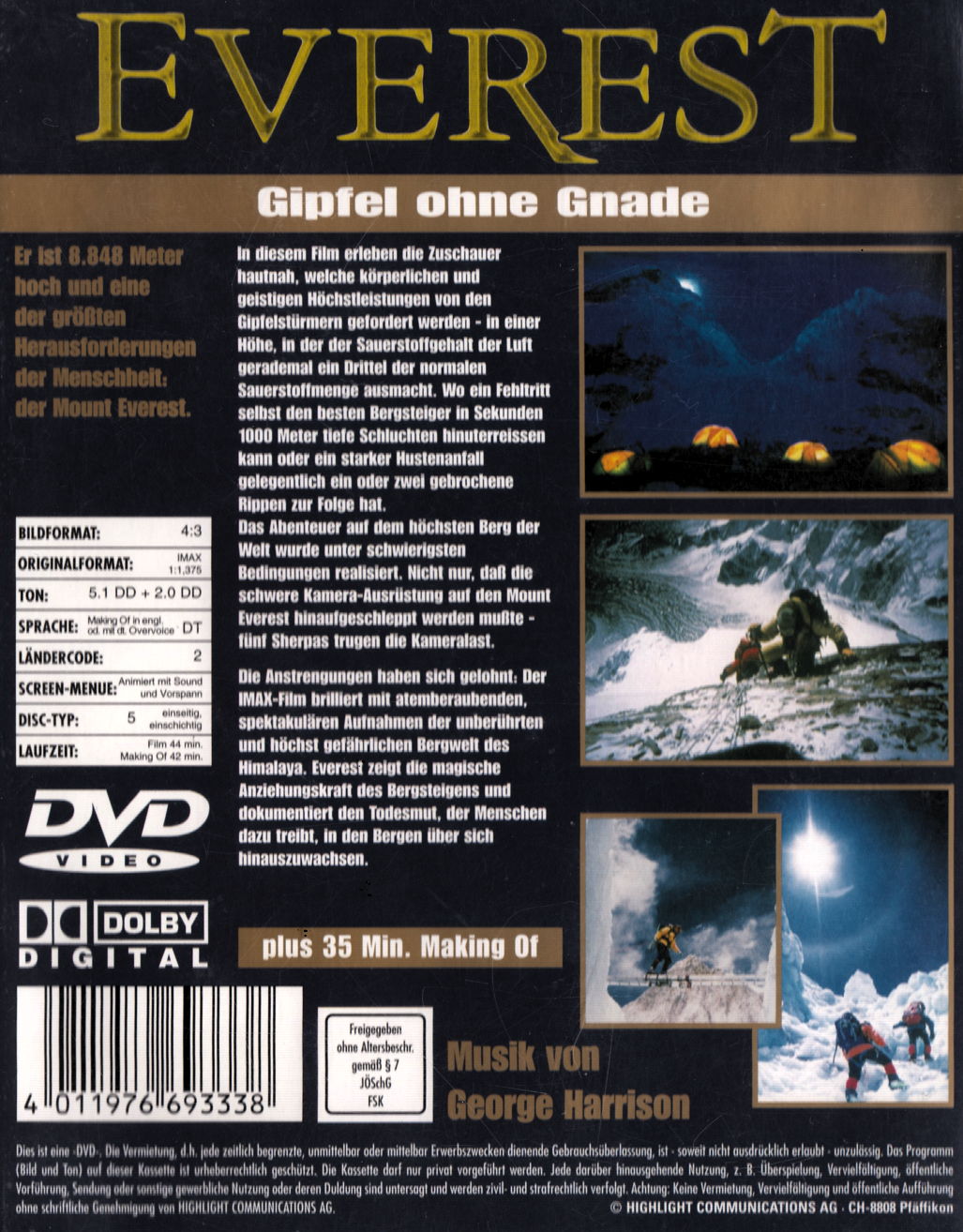 Er ist 8.848 Meter hoch und eine der grössten Herausforderungen der Menschheit: der Mount Everest. In diesem Film erleben die Zuschauer hautnah, welche körperlichen und geistigen Höchstleistungen von den Gipfelstürmern gefordert werden - in einer Höhe, in der der Sauerstoffgehalt der Luft gerade mal ein Drittel der normalen Sauerstoffmenge ausmacht. Wo ein Fehltritt selbst den besten Bergsteiger in Sekunden 1000 Meter tiefe Schluchten hinunterreissen kann oder ein starker Hustenanfall gelegentlich ein oder zwei gebrochene Rippen zur Folge hat. Das Abenteuer auf dem höchsten Berg der Welt wurde unter schwierigsten Bedingungen realisiert. Nicht nur, dass die schwere Kamera-Ausrüstung auf den Mount Everest hinaufgeschleppt werden musste - fünf Sherpas trugen die Kameralast.