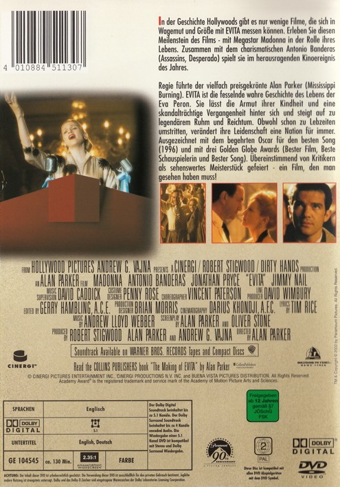 In der Geschichte Hollywoods gibt es nur wenige Filme, die sich in Wagemut und Grösse mit Evita messen können. Erleben Sie diesen Meilenstein des Films - mit Megastar Madonna in der Rolle ihres Lebens. Zusammen mit dem charismatischen Antonio Banderas spielt sie im herausragenden Kinoereignis des Jahres. Regie führte der vielfach preisgekrönte Alan Parker. "Evita" ist fesselnde wahre Geschichte des Lebens der Eva Peron. Sie lässt die Armut ihrer Kindheit und eine skandalträchtige Vergangenheit hinter sich und steigt auf zu legendärem Ruhm und Reichtum. Obwohl schon zu Lebzeiten umstritten, verändert ihre Leidenschaft eine Nation für immer. Ausgezeichnet mit dem begehrten Oscar für den besten Song (1996) und mit drei Golden Globe Awards (Bester Film, Beste Schauspielerin und Bester Song). Übereinstimmend von Kritikern als Sehenswertes Meisterstück gefeiert - ein Film, den man gesehen haben muss!