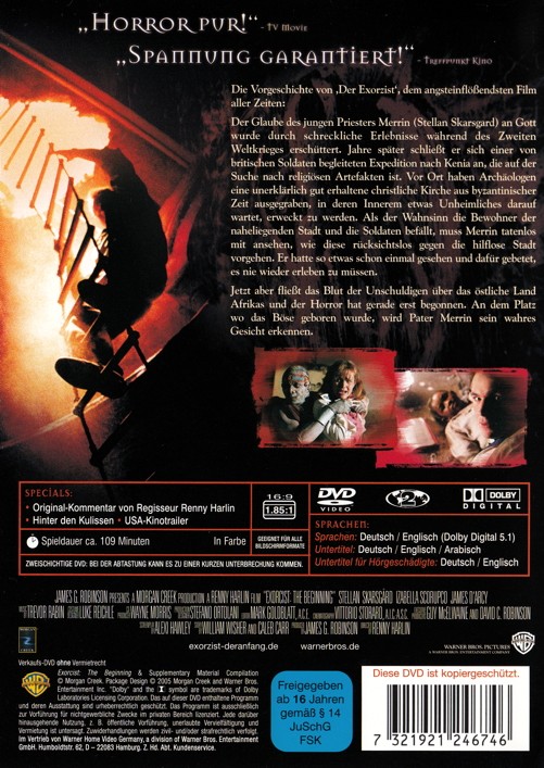 Der Glaube des jungen Priesters Merrin an Gott wurde durch schreckliche Erlebnisse während des Zweiten Weltkriees erschüttert. Jahre später schliesst er sich einer von britischen Soldaten begleiteten Expedition nach Kenia an, die auf der Suche nach religiösen Artefakten ist. Vor Ort haben Archäologen eine unerklärlich gut erhaltene christliche Kirche aus byzantinischer Zeit ausgegraben, in desen Ineren etwas Umheimliches darauf wartet, erweckt zu werden.. Als der Wahnsinn die Bewohner der naheliegenden Stadt und die Soldaten befällt, muss Merrin tatenlos mit ansehen, wie diese rücksichtslos gegen die hilfslose Stadt vorgehen. Er hatte so etwas schon einmal gesehen und dafür gebetet, es nie wieder erleben zu müssen. Jetzt aber fliesst das Blut der Unschuldigen über das östliche Land Afrikas und der Horror hat gerade erst begonnen. An dem Platz wo das Böse geboren wurde, wird Pater Merrin sein wahres Gesicht entdecken...