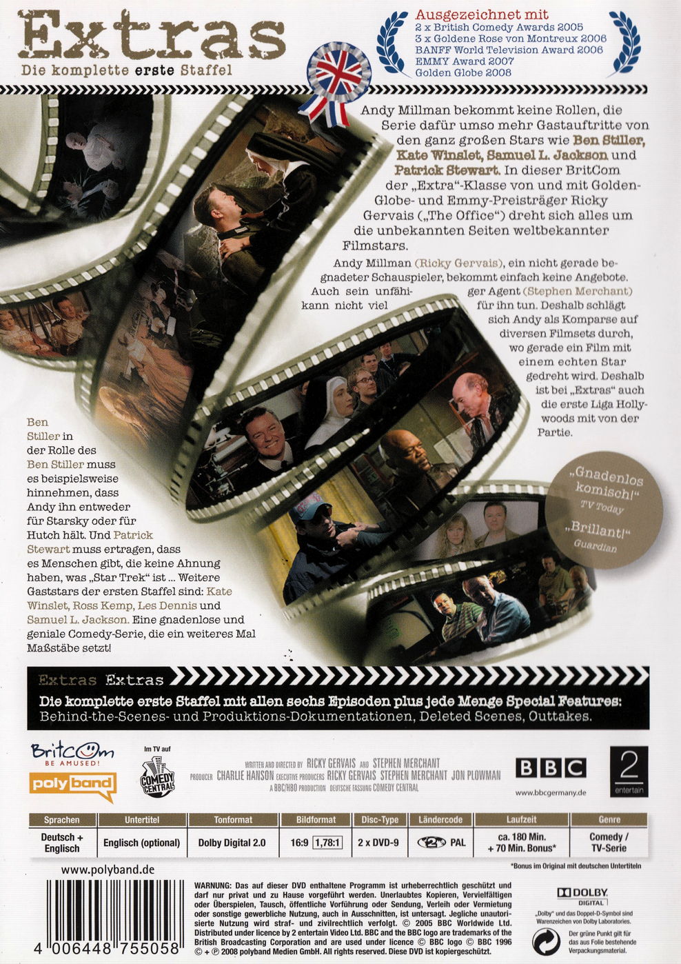 In dem neuen BritCom-Hit von und mit den beiden "TheOffice"-Machern Ricky Gervais und Stephen Merchant gibt es Cameos am laufenden Band! Diese BritCom der "Extra"-Klasse von und mit Golden Globe und Emmy-Preisträger Ricky Gervais ("The Office") dreht sich alles um die unbekannten Seiten weltbekannter Filmstars.