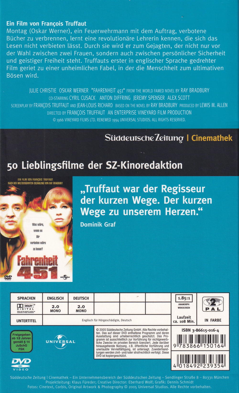 Francois Truffaut prophezeit in "Fahrenheit 451" eine Welt, in der kein gedrucktes Wort mehr existiert. Feuerwehreinheiten überwachen Verdächtige, stöbern verbotene Buchbesitzer auf und zerstören jedes bedruckte Papier. Zu einer dieser gehassten Einheiten gehört auch Montag, der seine Arbeit liebt und seit 5 Jahren nie eine Frage gestellt hat. Da lernt er eines Tages Clarisse kennen, und plötzlich kommt ihm seine Ehefrau Linda, die ihre Tage mit Tabletten- und Fernsehkonsum verbringt, entsetzlich langweilig vor. Heimlich entflieht er dieser kontrollierten Welt und beginnt nachts zu lesen, obgleich er weiss, dass dies tödliche Konsequenzen haben kann...