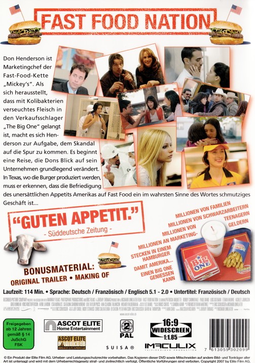 Als sich herausstellt, dass mit Kolibakterien verseuchtes Fleisch in den Verkaufsschlager „The Big One“ gelangt ist, macht es sich Don Henderson zur Aufgabe, dem Skandal auf die Spur zu kommen. Es beginnt eine Reise, die Dons Blick auf sein Unternehmen grundlegend verändert. In Texas, wo die Burger produziert werden, muss er erkennen, dass der unersättliche Appetit Amerikas auf Fast Food ein im wahrsten Sinne des Wortes schmutziges Geschäft ist: Fern ab der Firmenzentrale in Kalifornien eröffnet sich ihm die bittere Realität illegaler Immigranten, die Wahrheit über brutale Schlachtmethoden und die Gründe für die miserable Qualität des Burgerfleisches. Er erfährt auch, dass sein Arbeitgeber all das nicht nur billigend in Kauf nimmt, sondern ursächlich dafür verantwortlich ist...