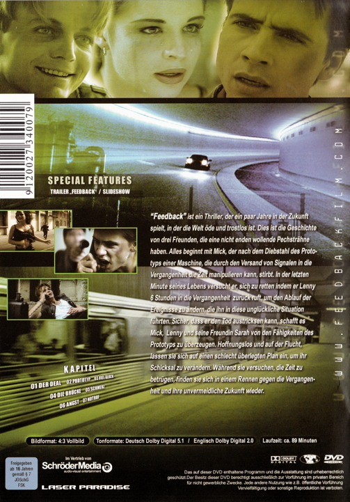 "Feedback" ist ein Thriller, der ein paar Jahre in der Zukunft spielt, in der die Welt öde und trostlos ist. Dies ist die Geschichte von drei Freunden, die eine nicht enden wollende Pechsträhne haben. Alles beginnt mit Mick, der nach dem Diebstahl des Prototyps einer Maschine, die durch den Versand von Signalen in die Vergangenheit die Zeit manipulieren kann, stirbt. In der letzten Minute seines Lebens versucht er, sich zu retten, indem er Lenny sechs Stunden in die Vergangenheit zurück ruft, um den Ablauf der Ereignisse zu ändern, die ihn in diese unglückliche Situation führten. Sicher, dass er den Tod austricksen kann, schafft es Mick, Lenny und seine Freundin Sarah von den Fähigkeiten des Prototyps zu überzeugen. Hoffnungslos und auf der Flucht, lassen sie sich auf einen schlecht überlegten Plan ein, um ihr Schicksal zu verändern. Während sie versuchen, die Zeit zu betrügen, finden sie sich in einem Rennen gegen die Vergangenheit und ihre unvermeidliche Zukunft wieder...