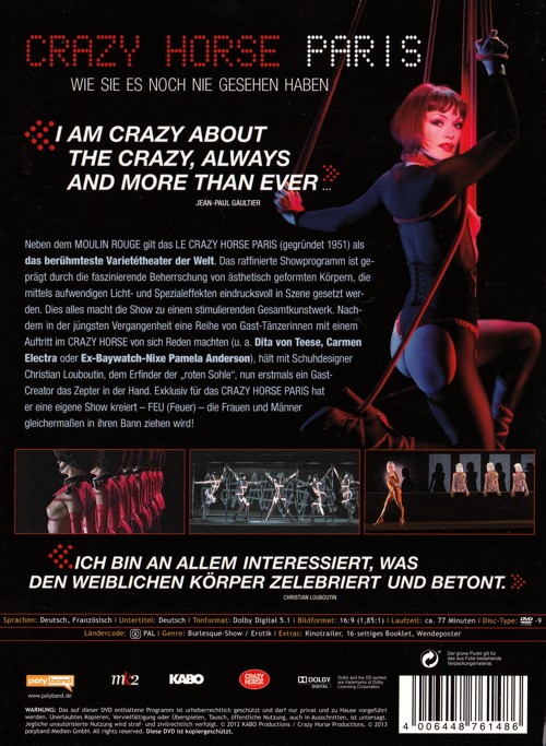Neben dem MOULIN ROUGE gilt das LE CRAZY HORSE PARIS (gegründet 1951) als das berühmteste Varietétheater der Welt. Das raffinierte Showprogramm ist geprägt durch die faszinierende Beherrschung von ästhetisch geformten Körpern, die mittels aufwendigen Licht- und Spezialeffekten eindrucksvoll in Szene gesetzt werden. Dies alles macht die Show zu einem stimulierenden Gesamtkunstwerk. Nachdem in der jüngsten Vergangenheit eine Reihe von Gast-Tänzerinnen mit einem Auftritt im Crazy Horse von sich Reden machten (u.a. Dita von Teese, Carmen Electra oder Ex-Baywatch-Nixe Pamela Anderson), hält mit Schuhdesigner Christian Louboutin, dem Erfinder der "roten Sohle", nun erstmals ein Gast-Creator das Zepter in der Hand. Exklusiv für das Crazy Horse Paris hat er eine eigene Show kreiert - FIRE - welche nun erstmals auf DVD zu sehen ist und dabei Frauen und Männer gleichermaßen in ihren Bann ziehen wird!