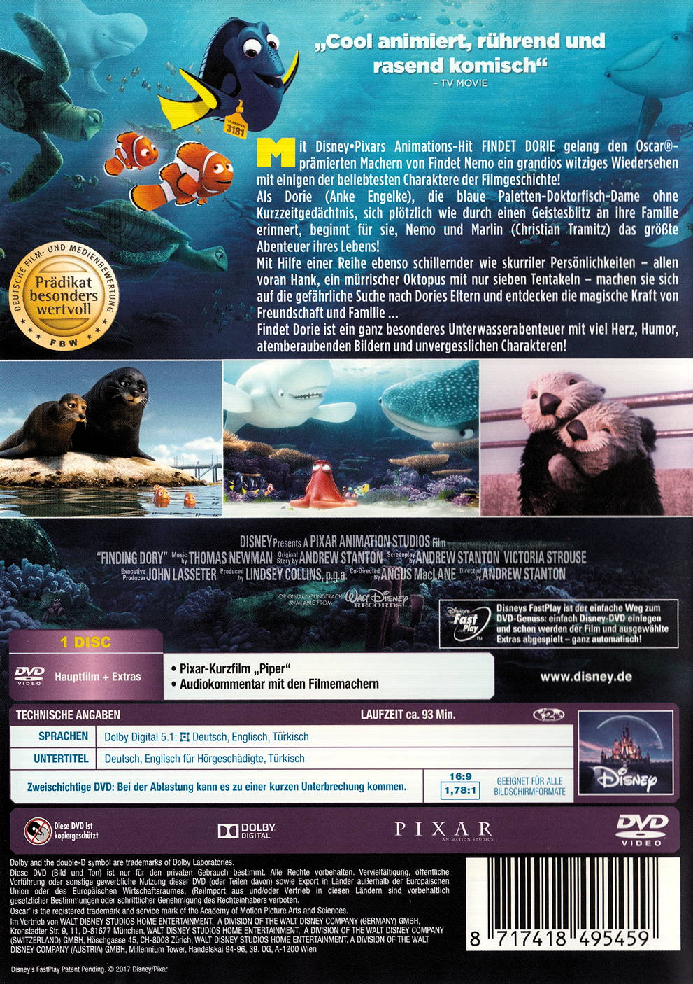 "Doch, ich vergess immer alles sofort, das liegt bei uns in der Familie. Ähm, das heisst, zumindest glaube ich das... hmmm... wo sind die eigentlich?" Warum Dorie wohl allein im Ozean unterwegs war an dem Tag an dem sie Marlin traf? Diese Frage stellt sich bereits in Findet Nemo. Und endlich gibt es auch die Antwort darauf. Denn in Findet Dorie macht sich die unfassbar vergessliche Paletten-Doktorfisch-Dame nun gemeinsam mit Nemo und Marlin auf die Suche nach ihren Wurzeln. Einmal quer durch das Riff vor der kalifornischen Küste, zwischen versunkenen Schiffen und Riesenalgenwäldern hindurch, trifft das Trio auf altbekannte Gefährten wie die Aquariumbande, aber auch viele neue, lustige und liebenswerte Meeresbewohner und schwimmt spektakulären Abenteuern und aufregenden Überraschungen entgegen...