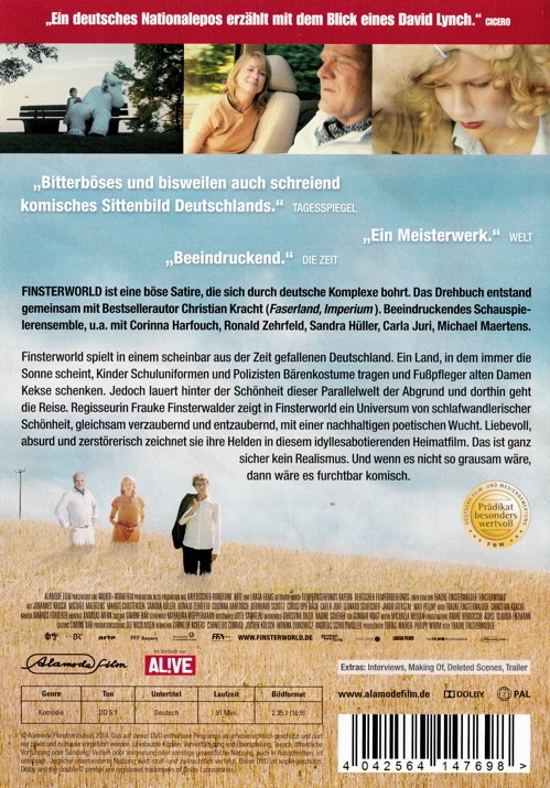 Finsterworld spielt in einem scheinbar aus der Zeit gefallenen Deutschland. Ein Land, in dem immer die Sonne scheint, Kinder Schuluniformen und Polizisten Bärenkostüme tragen und Fußpfleger alten Damen Kekse schenken. Jedoch lauert hinter der Schönheit dieser Parallelwelt der Abgrund und dorthin geht die Reise. Regisseurin Frauke Finsterwalder zeigt in Finsterworld ein Universum von schlafwandlerischer Schönheit, gleichsam verzaubernd und entzaubernd, mit einer nachhaltigen poetischen Wucht. Liebevoll, absurd und zerstörerisch zeichnet sie ihre Helden in diesem idyllesabotierenden Heimatfilm. Das ist ganz sicher kein Realismus. Und wenn es nicht so grausam wäre, dann wäre es furchtbar komisch. Das Drehbuch entstand gemeinsam mit Bestsellerautor Christian Kracht (Faserland, Imperium). Mit Corinna Harfouch, Ronald Zehrfeld, Sandra Hüller, Carla Juri, Michael Maertens uva.