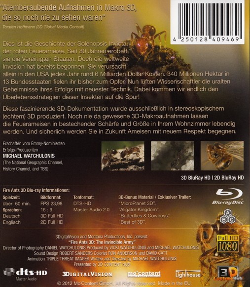 Diese faszinierende 3D-Dokumentation ist ursprünglich gedreht in stereoskopischem 3D, es gab keine nachträgliche Konvertierung wie bei vielen anderen Produkten, die auf dem Markt sind! Noch nie da gewesene Makroaufnahmen lassen die Feuerameisen in ihren Lebenswelten in bestechender Schärfe und Grösse in Ihrem Wohnzimmer lebendig werden. Diese Produktion setzt neue Massstäbe!