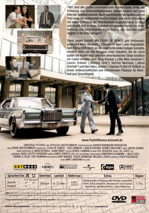 1967 sind alle großen amerikanischen Autohersteller hinter dieser Erfindung her: dem Intervall-Scheibenwischer. Sein Erfinder, der Universitätsprofessor Robert Kearns, verhandelt lange mit Ford, bis der Gigant aus Detroit unvermittelt absagt. Kurz danach muss der enttäuschte Kearns erleben, wie der Ford Mustang mit seiner Erfindung der Öffentlichkeit vorgestellt wird. Kearns klagt und begibt sich in einen aufsehen- erregenden Kampf um Anerkennung und Gerechtigkeit. Seine Frau Phyllis und seine Kinder unterstützen ihn nach Kräften. Doch der Konzern hat Geld, Macht und vor allem: Zeit. Kann Kearns den übermächtigen Gegner in die Knie zwingen?