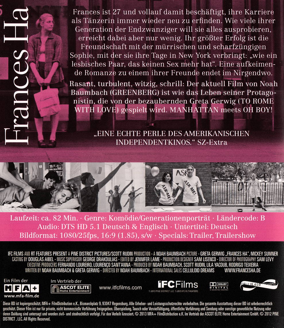 Frances ist 27 und vollauf damit beschäftigt, ihre Karriere als Tänzerin immer wieder neu zu erfinden. Wie viele ihrer Generation der Endzwanziger will sie alles ausprobieren, erreicht dabei aber nur wenig. Ihr größter Erfolg ist die Freundschaft mit der mürrischen und scharfzüngigen Sophie, mit der sie ihre Tage in New York verbringt: "wie ein lesbisches Paar, das keinen Sex mehr hat". Eine aufkeimende Romanze zu einem ihrer Freunde endet im Nirgendwo.