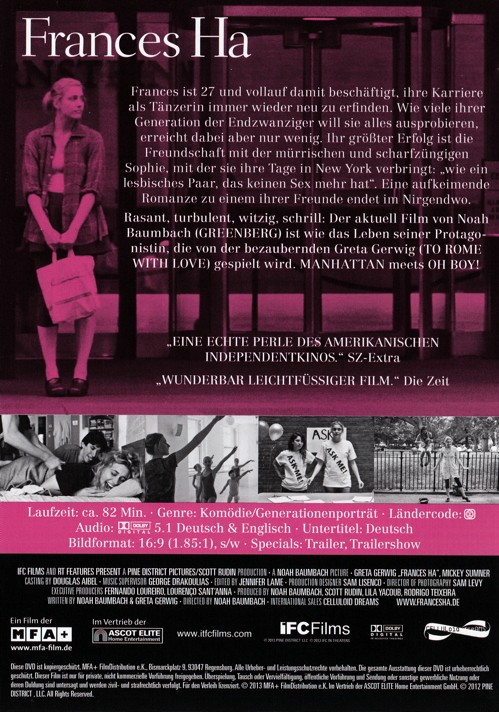 Frances ist 27 und vollauf damit beschäftigt, ihre Karriere als Tänzerin immer wieder neu zu erfinden. Wie viele ihrer Generation der Endzwanziger will sie alles ausprobieren, erreicht dabei aber nur wenig. Ihr grösster Erfolg ist die Freundschaft mit der mürrischen und scharfzüngigen Sophie, mit der sie ihre Tage in New York verbringt: "wie ein lesbisches Paar, das keinen Sex mehr hat". Eine aufkeimende Romanze zu einem ihrer Freunde endet im Nirgendwo.