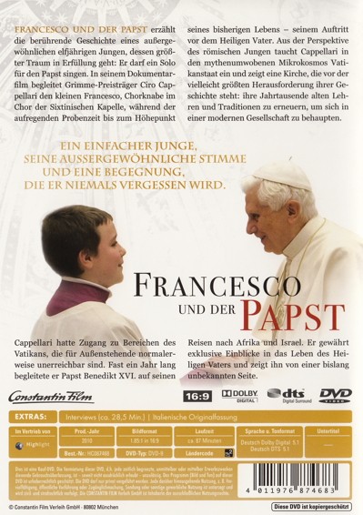Francesco und der Papst erzählt die berührende Geschichte eines aussergewöhnlichen Junden, dessen grösster Traum in Erfüllung geht: Er darf ein Solo für den Papst singen. In seinem Dokumentarfilm begleitet Grimme-Preisträger Ciro Cappellari den kleinen Francesco, Chorknabe im Chor der Sixtinischen Kapelle, während der aufregenden Probezeit bis zum Höhepunkt seines bisherigen Lebens - seinem Auftritt vor dem Heiligen Vater. Aus der Perspektive des römischen Jungen taucht Cappellari in den mythenumworbenen Mikrokosmos Vatikansstaat ein und zeigt eine Kirche, die vor der vielleicht grössten Herausforderung ihrer Geschichte steht: ihre Jahrtausende alten Lehren und Traditionen zu erneuern, um sich in einer modernen Gesellschaft zu behaupten.