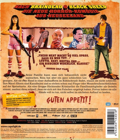 Seine Familie kann man sich bekanntlich nicht aussuchen, Rina hat aber ein ganz schlechtes Los gezogen. Als sie eine Hand in einer Auflaufform im Kühlschrank findet, staunt sie nicht schlecht: Ihre Maori-Eltern sind Kannibalen und so stehen schon mal Finger oder Menschenfleischbällchen auf der Speisekarte. Als eine Gruppe flüchtender Krimineller die Familie als Geiseln nimmt, merken diese schnell, dass sie sich mit den Falschen angelegt haben. Fortan haben sie alle Hände voll zu tun, nicht selbst im nächsten Auflauf zu landen. Guten Appetit!