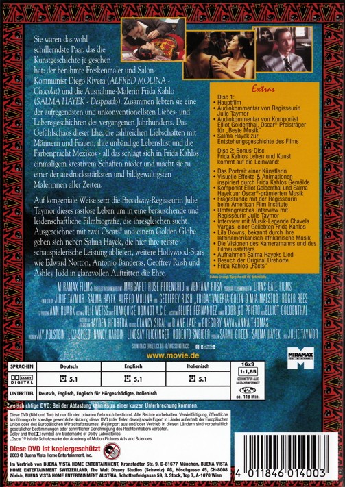 Edward Norton, Antonio Banderas, Alfred Molina, Geoffrey Rush, Salma Hayek, Ashley Judd, Roger Rees, Valeria Golino, Saffron Burrows, Mía Maestro...Diego Luna, Jorge Zepeda, Julian Sedgwick, Loló Navarro, Fermin Martinez, Roberto Medina, Patricia Reyes Spíndola, Enoc Leaño, Benjamín Benítez, Ehécatl Chávez, Karine Plantadit-Bageot, Chavela Vargas, Andres Montiel, Alejandro Usigli, Didi Conn, Amelia Zapata, Jorge Valdés García, Aida López, William Raymond, Antonio Zavala, Martha Claudia Moreno, Diego Espinosa, Mary Luz Palacio, Mauricio Osorio, Maria Ines Pintado, Margarita Sanz, Claudia Frías, Lucia Bravo, Elliot Goldenthal, Omar Rodríguez, Felipe Fulop, Eszter Zakariás, Lila Downs, Ivana Sejenovich, Jorge Guerrero, Anthony Alvarez