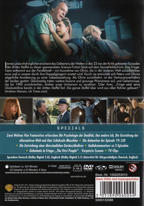Immer undurchdringlicher erscheint das Geheimnis der Welten in den 22 von der Kritik gefeierten Episoden der dritten Staffel zu dieser spannendsten Science-Fiction-Serie auf dem Fernsehbildschirm. Das Fringe-Team entkommt aus der Parallelwelt mit Ausnahme von Olivia, die in der anderen Welt zurückbleiben muss und in unserer durch ihre Doppelgängerin ersetzt wird: Durch sie entwickelt sich Peters und Olivias zögerliche Annäherung in eine Liebesbeziehung. Als Olivia zurückkehrt, ist das Vertrauensverhältnis der beiden gestört. Gleichzeitig treten weitere bizarre und grausige Phänomene auf, und Geheimnisse, die bis 1985 zurückreichen, drohen unser Universum zu zerstören. Oder ihres.