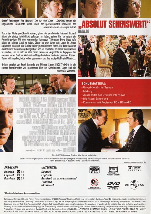 Durch den Watergate-Skandal ruiniert, glaubt der gescheiterte Präsident Richard Nixon (Frank Langella) die einzige Möglichkeit gefunden zu haben, seinen Ruf zu retten: Ein Fernsehinterview. Mit dem vermeintlich harmlosen David Frost (Michael Sheen) scheint der perfekte Mann gefunden zu sein. Dieser ist eher durch sein Leben im Jet Set aufgefallen als durch die Qualität seiner Arbeit. Für Frost bedeutet das Interview die einmalige Gelegenheit, sich als ernsthafter Journalist einen Namen zu machen und so setzt er alles daran Nixon auf Augenhöhe zu begegnen. Ein messerscharfes Duell um Wahrheit und Lüge fordert von beiden all ihr Können. Keiner will aufgeben, beide wollen gewinnen - und ihre einzige Waffe sind Worte...