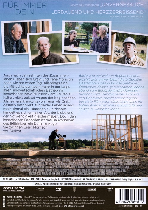 Auch nach Jahrzehnten des Zusammenlebens lieben sich Craig und Irene Morrison noch wie am ersten Tag. Allerdings sind die Mittachtziger kaum mehr in der Lage, ihren landwirtschaftlichen Betrieb im kanadischen New Brunswick am Laufen zu halten, nicht zuletzt wegen der beginnenden Alzheimererkrankung von Irene. Als Craig deshalb beschliesst, für beider Lebensabend noch einmal ein Häuschen zu errichten, handelt es sich um einen Akt der Liebe und der Notwendigkeit gleichermassen. Doch den kanadischen Behörden ist das Bauvorhaben des 86jährigen ein Dorn im Auge. Sie zwingen Craig Morrison vor Gericht.