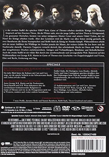 In der zweiten Staffel der epischen HBO-Serie Game of Thrones erheben sämtliche Könige von Westeros Anspruch auf den Eisernen Thron. Als der Winter naht, sitzt der junge Joffrey auf dem Thron in Königsmund, ein grausamer Herrscher, beraten von seiner intriganten Mutter Cersei und seinem Onkel Tyrion, der zur Hand des Königs erhoben wurde. Aber den Lennisters wird die Macht von allen Seiten streitig gemacht, da zwei Baratheons die Krone beanspruchen und Robb Stark als König im Norden kämpft. Währenddessen erhebt sich ein neuer Anführer der Wildlinge im Norden jenseits der Mauer, der weitere Gefahr für Jon Snow und die Nachtwache darstellt. Daenerys Targaryen versucht derweil, ihre schwindende Macht im Osten mit Hilfe ihrer drei neugeborenen Drachen zurückzuerobern. Intrigen und Verhandlungen, Bündnisse und Befindlichkeiten: Auch die zweite Staffel ist ein wilder Ritt durch eine atemberaubende und unvergessliche Welt. Basierend auf den Weltbestsellern von George R.R. Martin ist Game of Thrones eine Geschichte von Doppelzüngigkeit und Verrat, Ehre und Recht, Eroberung und Sieg.