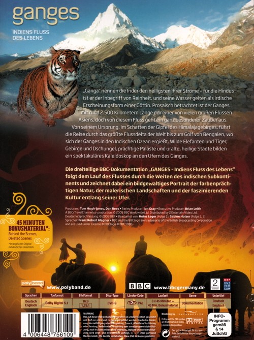 "Ganga" nennen die Inder den heiligsten ihrer Ströme – für die Hindus ist er der Inbegriff von Reinheit, und seine Wasser gelten als irdische Erscheinungsform einer Göttin. Prosaisch betrachtet ist der Ganges mit rund 2.500 Kilometern Länge nur einer von vielen großen Flüssen Asiens, doch von diesem Fluss geht ein ganz besonderer Zauber aus. Von seinem Ursprung, im Schatten der Gipfel des Himalajagebirges, führt die Reise durch das größte Flussdelta der Welt bis zum Golf von Bengalen, wo sich der Ganges in den Indischen Ozean ergießt. Wilde Elefanten und Tiger, Gebirge und Dschungel, prächtige Paläste und uralte, heilige Städte bilden ein spektakuläres Kaleidoskop an den Ufern des Ganges.