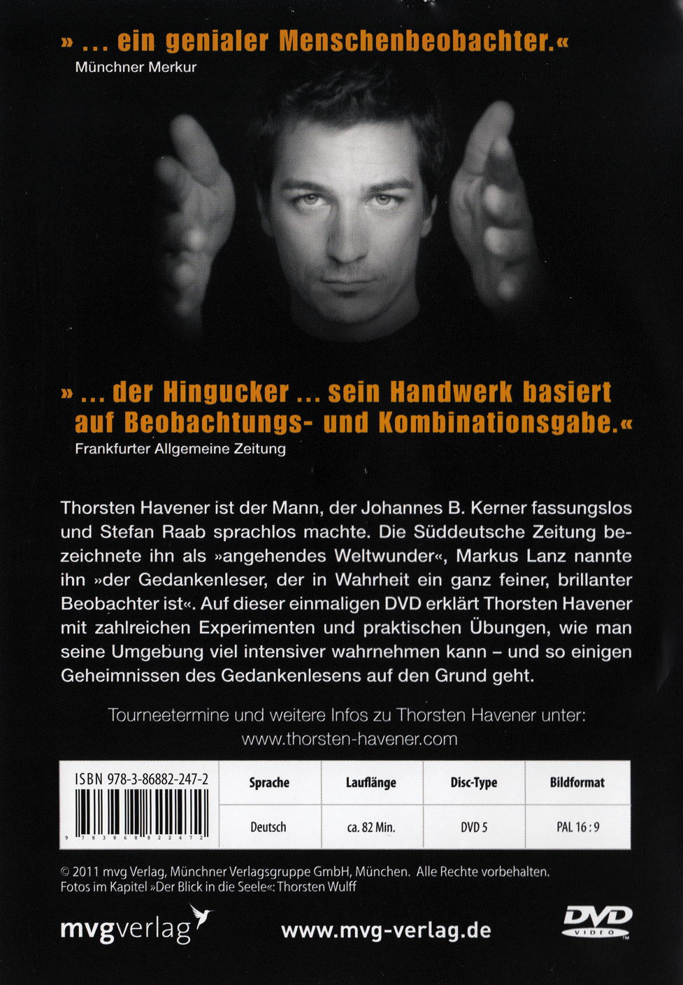 Thorsten Havener ist der Mann, der Johannes B. Kerner fassungslos und Stefan Raab sprachlos machte. Die Süddeutsche-Zeitung bezeichnete ihn als 'angehendes Weltwunder', Markus Lanz nannte ihn 'der Gedankenleser, der in Wahrheit ein ganz feiner, brillanter Beobachter ist'. Auf dieser einmaligen DVD erklärt Thorsten Havener mit zahlreichen Experimenten und praktischen Übungen, wie man seine Umgebung viel intensiver wahrnehmen kann - und so einigen Geheimnissen des Gedankenlesens auf den Grund geht.