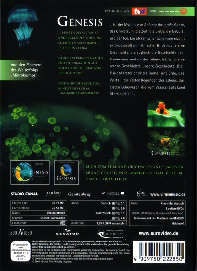 Mit eindrucksvollen Bildern erklärt ein afrikanischer Schamane die Entstehung unseres Universums, die Anfänge des Lebens und den ewigen Kreislauf der Natur. In sechs Jahren wurde Genesis unter anderem auf den Galapagos-Inseln, in Island, in Polynesien, auf Madagaskar sowie in einem französischen Forschungslabor gedreht. Das Regisseur-Duo Claude Nuridsany und Marie Pérennou (Mikrokosmos, Das Wunder der Natur) schafft es, den Zuschauer durch faszinierende Bilder und spektakuläre Nahaufnahmen zu fesseln und in die Weiten unseres Planten zu entführen.