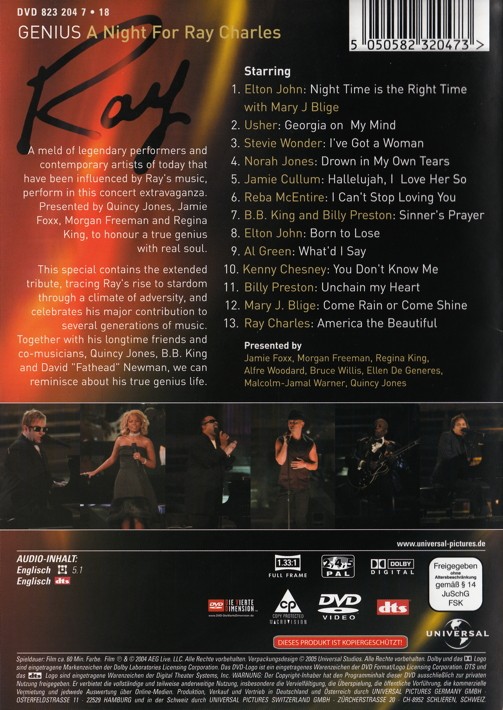 "Genius: A Night for Ray Charles", die Aufzeichnung des Tribute-Concerts, das am 08. Oktober 2004 im Staples Center, Los Angeles zu Ehren des verstorbenen Ray Charles stattfand.