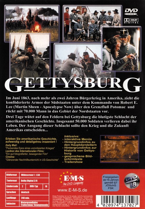 Im Juni 1863, nach mehr als 2 Jahren blutiger Auseinandersetzungen, zieht die konförderierte Armee von Westvirginia unter dem Kommando von Robert E. Lee, einem der besten Militärtaktiker, über den Grenzfluss, um in den Nordstaaten einzumarschieren. 70.000 Mann ziehen Richtung Norden, um die Soldaten der Union aus ihren Verstecken zu locken und zu vernichten. Drei Tage lang wütet auf den Feldern von Gettysburg eine der blutigsten Schlachten der amerikanischen Geschichte. Insgesamt 40.000 Soldaten werden dahingemetzelt. Der Ausgang dieser Schlacht entscheidet den Krieg und die Zukunft Amerikas...