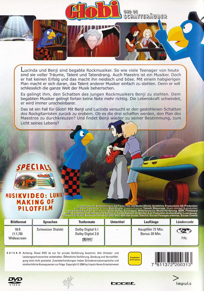 Lucinda und Benji sind begabte Rockmusiker. So wie viele Teenager von heute sind sie voller Träume, Talent und Tatendrang. Auch Maestro ist ein Musiker. Doch er hat keinen Erfolg und das macht ihn neidisch und böse. Mit einem habgierigen Plan macht er sich daran, das Talent anderer Musiker einfach zu stehlen. Denn er will schliesslich die ganze Welt der Musik beherrschen. Es gelingt ihm, den Schatten des jungen Rockmusikers Benji zu stehlen. Dem begabten Musiker gelingt fortan keine Note mehr richtig. Die Lebenskraft schwindet, er wird immer unscheinbarer. Das ist ein Fall für Globi! Mit Benji und Lucinda versucht er den gestohlenen Schatten des Rockgitarristen zurück zu erobern. Ob es die drei schaffen werden, den Plan des Maestros zu durchkreuzen? Und findet Benji's wieder zu seiner Bestimmung, zum Licht seines Lebens?