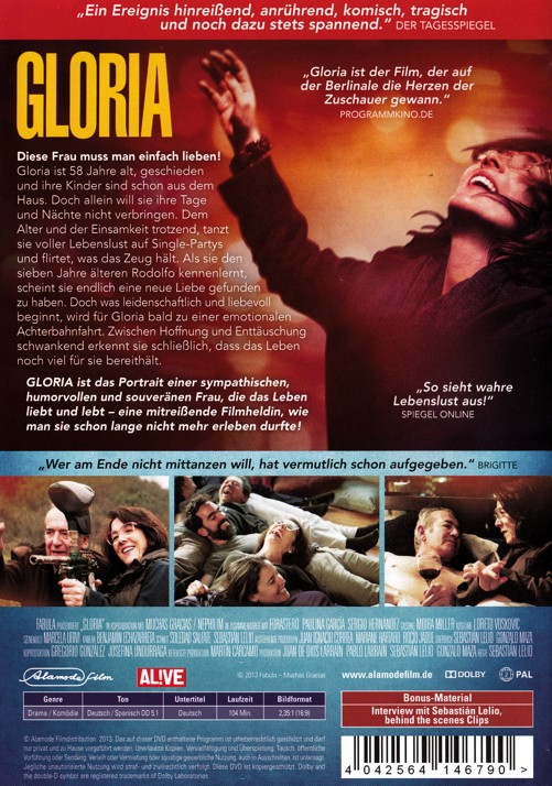 Gloria (Paulina García) ist eine geschiedene Mittfünfzigerin und dem Leben gegenüber, trotz ihrer gelegentlichen Einsamkeit, positiv gestimmt. Sie hat zwei erwachsene Kinder, einen durchschnittlichen Bürojob und viele Freunde. Voller Lebensfreude stürzt sie sich in das nächtliche Partyleben und besucht dabei auch Single-Partys, um nette Männer kennenzulernen. Als sie auf den etwas älteren, aber durchaus attraktiven Rodolfo (Sebastian Hernández) trifft, scheint Glorias Wunsch nach Zweisamkeit in Erfüllung zu gehen. Voller Übermut und Hoffnung stürzt sie sich in eine Beziehung mit ihm, doch schnell muss sie feststellen, dass nicht alles Gold ist was glänzt und diese neue Beziehung einige Schwierigkeiten mit sich bringt. Denn Rodolfo ist erst ein Jahr von seiner Familie getrennt, doch wirklich überwunden hat er die Trennung noch nicht. Sobald seine Familie ruft, ist er sofort bereit, ihr beizustehen und vernachlässigt dabei Gloria. Obwohl sie darunter leidet, gibt sie nicht auf und merkt, dass das Leben noch vieles für sie bereithält.