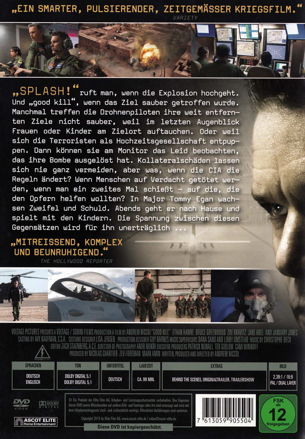 "SPLASH!" ruft man, wenn die Explosion hochgeht und "good kill", wenn das Ziel sauber getroffen wurde. Manchmal treffen die Drohnenpiloten ihre weit entfernten Ziele nicht sauber, weil im letzten Augenblick Frauen oder Kinder am Zielort auftauchen. Oder weil sich die Terroristen als Hochzeitsgesellschaft entpuppen. Dann können sie am Monitor das Leid beobachten, das ihre Bombe ausgelöst hat. Kollateralschäden lassen sich nie ganz vermeiden, aber was, wenn die CIA die Regeln ändert? Wenn Menschen auf Verdacht getötet werden, wenn man ein zweites Mal schiesst - auf die, die den Opfern helfen wollten? In Major Tommy Egan (Ethan Hawke) wachsen Zweifel und Schuld. Abends geht er nach Hause und spielt mit seinen Kindern. Die Spannung zwischen diesen Gegensätzen wird für ihn unerträglich.