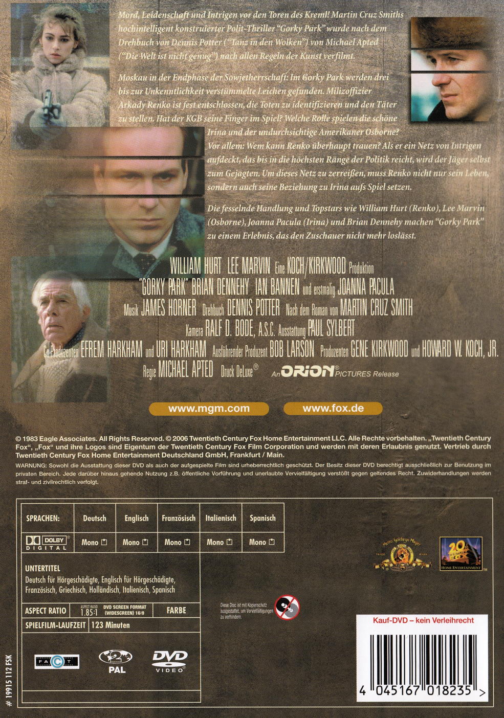 Der Schauplatz ist Moskau. Gorky Park im Winter. Arkady Renko, Spitzenmann der russischen Polizei, wird mit der Klärung schier unlösbarer Morde beauftragt. Er wird hellhörig, als ein hoher Offizier sich für den Fall interessiert und entdeckt, dass einer der Ermordeten amerikanischer Staatsbürger war. Ein New Yorker Detektiv, ein zwielichtiger Staatsanwalt und ein amerikanischer Millionär scheinen die Marionetten undurchsichtiger Machenschaften zu sein. Doch wer hält die Fäden in der Hand? Die Intrigen ziehen immer weitere Kreise, der Skandal ist unvermeidlich. Ein aufpeitschender Action-Thriller.