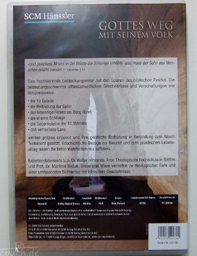 DVD, ca. 60 Minuten, SCM Hänssler 2010 Eine faszinierende Entdeckungsreise auf den Spuren des biblischen Exodus. Die bedeutungsschweren alttestamentlichen Geschehnisse und Vorschattungen wie bspw. die 10 Gebote, die Bedeutung der Opfer, die eherne Schlange, oder das verheissene Land werden präzise erläutert und ihre geistliche Bedeutung in Verbindung zum Neuen Testament gesetzt. Geschichtliche Bezüge zur Neuzeit und zum praktischen Lebensalltag lassen die tiefen Wahrheiten neu aufleben.