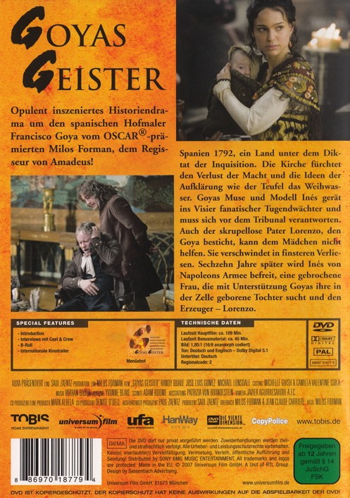 Spanien 1792, ein Land unter dem Diktat der Inquisition. Die Kirche fürchtet den Verlust der Macht und die Ideen der Aufklärung wie der Teufel das Weihwasser. Goyas Muse und Modell Inés gerät ins Visier fanatischer Tugendwächter und muss sich vor dem Tribunal verantworten. Auch der skrupellose Pater Lorenzo, den Goya besticht, kann dem Mädchen nicht helfen. Sie verschwindet in finsteren Verliesen. Sechzehn Jahre später wird Inés von Napoleons Armee befreit, eine gebrochene Frau, die mit der Unterstützung Goyas ihre in der Zelle geborene Tochter sucht, und den Erzeuger - Lorenzo.