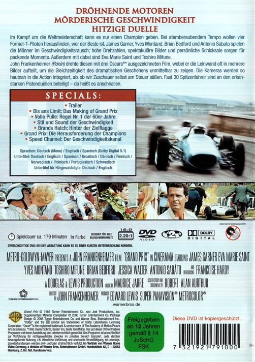 Im Kampf um die Weltmeisterschaft kann es nur einen Champion geben. Bei atemberaubendem Tempo wollen vier Formel-1-Piloten herausfinden, wer der Beste ist. James Garner, Yves Montand, Brian Bedford und Antonio Sabato spielen die Männer im Geschwindigkeitsrausch; hohe Drehzahlen, spektakuläre Bilder und persönliche Schicksale sorgen für packende Momente. Außerdem mit dabei sind Eva Marie Saint und Toshiro Mifune. John Frankenheimer drehte diesen mit drei Oscars ausgezeichneten Film, wobei er die Leinwand oft in mehrere Bilder aufteilt, um die Gleichzeitigkeit des dramatischen Geschehens unmittelbar zu zeigen. Die Kameras werden so hautnah in die Action integriert, als ob wir Zuschauer selbst am Steuer säßen. Fast 30 Spitzenfahrer sind an den orkan-starken Pistenduellen beteiligt – da heißt es anschnallen.