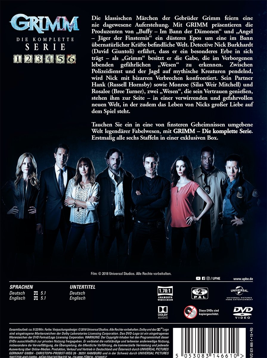 Die klassischen Märchen der Gebrüder Grimm feiern eine nie dagewesene Auferstehung. Mit Grimm präsentieren die Produzenten von Buffy - Im Bann der Dämonen und Angel - Jäger der Finsternis ein düsteres Epos um eine im Bann übernatürlicher Kräfte befindliche Welt. Detective Nick Burkhardt (David Giuntoli) erfährt, dass er ein besonderes Erbe in sich trägt - als Grimm besitzt er die Gabe, die im Verborgenen lebenden gefährlichen Wesen zu erkennen. Zwischen Polizeidienst und der Jagd auf mythische Kreaturen pendelnd, wird Nick mit bizarren Verbrechen konfrontiert. Sein Partner Hank (Russell Hornsby) sowie Monroe (Silas Weir Mitchell) und Rosalee (Bree Turner), zwei „Wesen, die sein Vertrauen geniessen, stehen ihm zur Seite - in einer verwirrenden und gefahrvollen neuen Welt, in der zudem das Leben von Nicks grosser Liebe auf dem Spiel steht. Tauchen Sie ein in eine von finsteren Geheimnissen umgebene Welt legendärer Fabelwesen, mit Grimm - Die komplette Serie. Erstmalig alle sechs Staffeln in einer exklusiven Box. Alle 123 Episoden auf 33 DVDs in einer Box.
