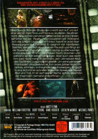 Eine Gruppe Biologie-Studenten macht sich auf, um auf einer kleinen Insel Flora und Fauna zu studieren. Sie ahnen nicht, dass sich ein perverser Filmemacher an ihre Fersen geheftet hat der Reality-TV produzieren will. Während sich die jungen Leute sicher fühlen, bannt er jede ihrer Bewegungen auf Zelluloid. Er beginnt mit harmlosen Szenen, steigert sich aber in einen Rausch und fängt an die Studenten Tag und vor allem nachts zu überwachen. Unbeobachtet filmt er die Frauen beim duschen und während sie sich selbst befriedigen. Aber auch das reicht ihm bald nicht mehr. Er will mehr, den ultimativen Kick: den Tod filmen. Live und nicht gestellt. Um seine perversen Phantasien umzusetzen ist ihm jedes Mittel recht. Piranhas, ertrinken, enthaupten oder Kreissägen. Er gerät in eine sich immer schneller drehende Spirale aus Gewalt, Blut und Tod. Er ist sich seiner Sache sicher, denn von der Insel kann niemand entkommen...
