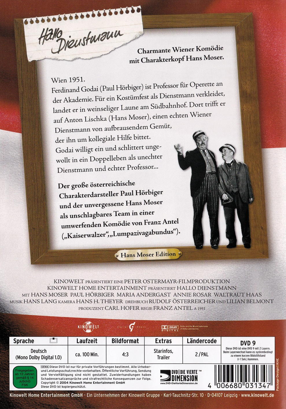 Kinowelt Hans Moser: Wien 1951. Anton Lischka, ein echter Wiener Dienstmann von aufbrausendem Gemüt, macht auf ungewöhnliche Art die Bekanntschaft von Ferdinand Godai, Professor für Operette an der Akademie. Godai hatte sich für ein Kostümfest als Dienstmann verkleidet, war in weinseliger Laune beim Südbahnhof gelandet und von Anton um kollegiale Hilfe gebeten worden. Dabei lernt Ferdinand auch Gaby kennen und lieben, die sich als neue Kollegin an der Akademie entpuppt. Einige wiedrige Umstände zwingen ihn, sein kompliziertes Doppelleben als echter Professor und unechter Dienstmann fortzusetzen. Auch Lischka, der sich mehr und mehr über die Unbeholfenheit seines "Kollegen" aufregt, wird in das Verwirrspiel einbezogen. Nur Gaby durchschaut es und trägt sogar zu dessen Ausweitung bei, um ihrem geliebten Professor-Dienstmann eine Lektion in Frauenlist zu erteilen. Die Schulaufführung der musikalischen Komödie "Hallo Dienstmann", in der sich auch Anton Lischka unfreiwillig bewähren muß, zerschlägt den gordischen Knoten, die richtigen Partner finden zueinander. Dienstmann, USK/FSK: 12+ VÃ--Datum: 10. 08. 04