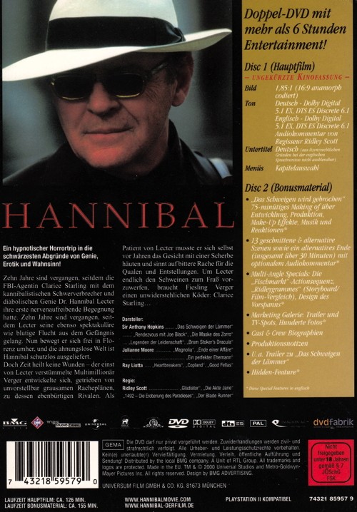 Zehn Jahre sind vergangen, seitdem die FBI Agentin Clarice Starling (Julianne Moore) im Hochsicherheitstrakt eines Gefängnisses für geistesgestörte Schwerverbrecher mit dem diabolischen Genie Dr. Hannibal Lecter (Anthony Hopkins) jene nervenaufreibenden Begegnungen hatte, die sie nicht nur auf die Spur eines perversen Serienmörders bracht:en, sondern sie auch nahe an ihr eigenes Lebenstrauma heranführten. Zehn Jahre sind vergangen, seitdem Lecter seine ebenso spektakuläre wie blutige Flucht aus dem Gefängnis gelang. Nun bewegt er sich frei in Europa umher, urld die ahnungslose Welt ist Hannibal schutzlos ausgeliefert. Auch in Starlings Gedanken treibt Lecter weiterhin sein Unwesen: Als grauenvolles Raunen von der Nachtseite der Welt sucht seine markerschütternde Stinme sie immer wieder in ihren Träumen heim. Mason Verger (Gary Oldman) gelang es ebenfalls nicht, Dr. Lecter zu vergessen. Kein Wunder, denn er war dessen sechstes Opfer. Zwar überlebte er die Attacke des Kannibalen, doch blieb er für immer von dieser unheilvollen Begegnung gezeichnet: Vergers Gesicht ist auf abscheuliche Weise entstellt. Als Erbe eines riesigen Familienvermögens setzt er nun sein ganzes Geld wie besessen zu einem einzigen Zweck ein: Lecter endlich dingfest zu machen und sich furchtbar an ihm zu rächen. Verger weiss, dass er Lecter einen unwiderstehlichen Köder präsentieren muss, um ihn aus seinem Versteck herauszulocken: Clarice Starling.